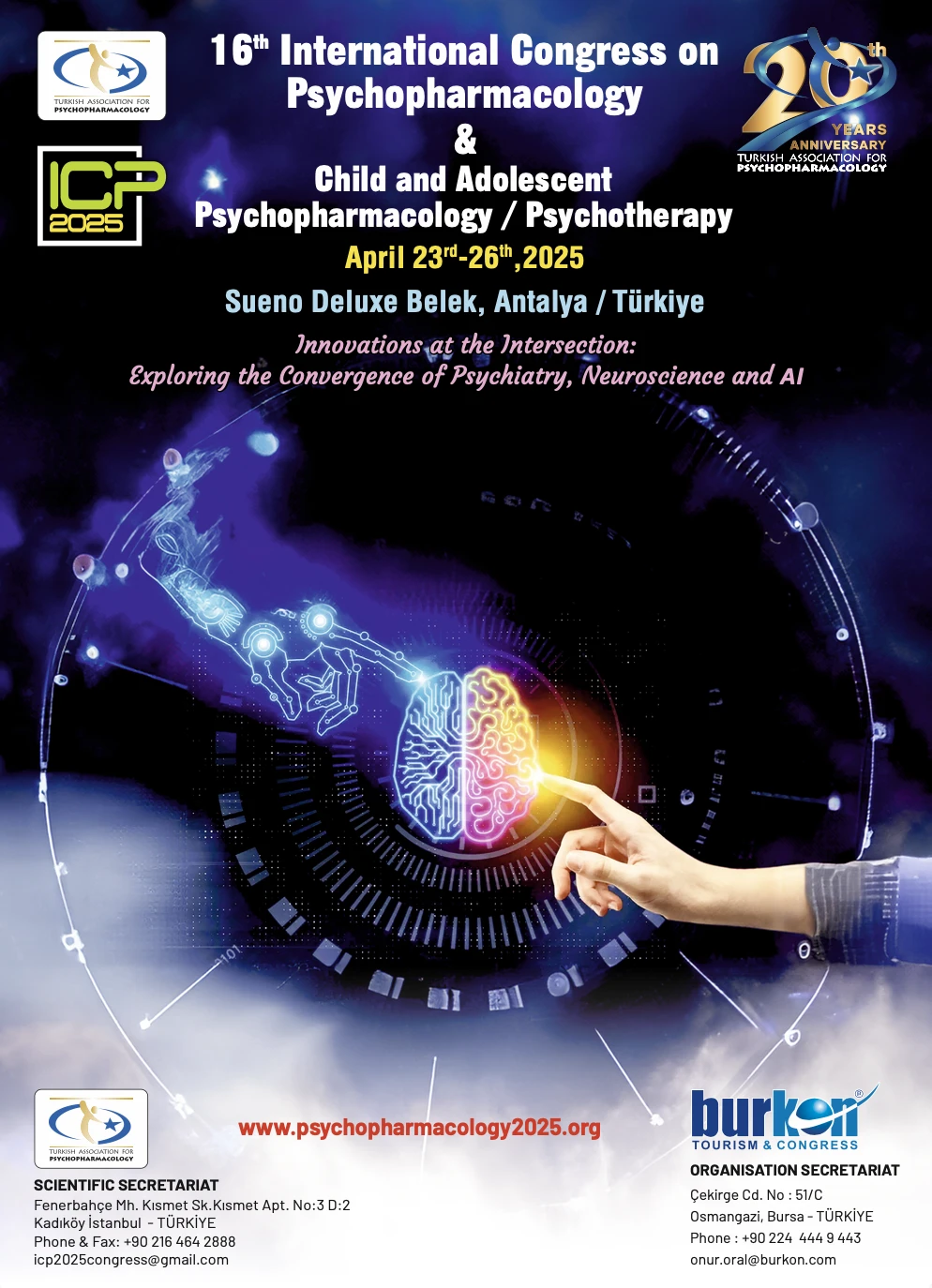 We are happy to invite you to join us again in an entire face-to-face meeting and make the ICP 2025 a memorable event. The motto of the congress is "Innovations at the Intersection: Exploring the Convergence of Psyciatry, Neuroscience and AI" During this four-day congress; distinguished national and international speakers and researchers will provide up-to-date information and the latest outstanding breakthroughs in psychopharmacology as well as other fields of clinical practice along with interactively sharing the latest trends in treatment-resistant cases and will offer practical solutions to contemporary challenges clinicians face and also review the latest developments in basic sciences, biological psychiatry, neuroscience, and psychiatric neuroimaging. Additionally, we aim to contribute to the integrative approach in psychiatric treatments through comprehensive discussions about diagnostic approaches, psychotherapies and other non-pharmacological treatments, and their administration standards and guidelines, which are bolstered by the most up-to-date clinical research.