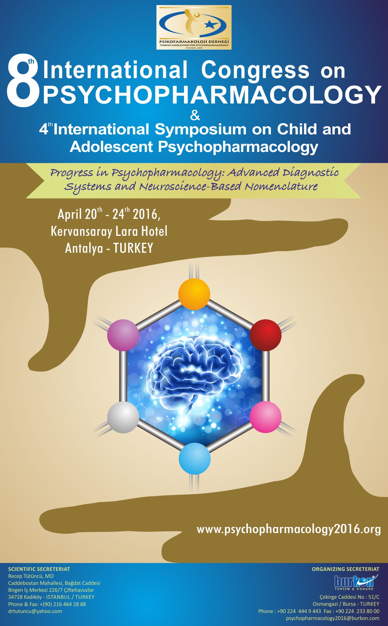 The 8th International Congress on Psychopharmacology and 4th International Symposium on Child and Adolescent Psychopharmacology, (8th ICP-4th ISCAP) will provide an opportunity for the attendees to refresh, update, and expand their knowledge in innovative research and challenging domains of psychopharmacology, biological psychiatry, neuroscience, and neuroimaging through contributions from distinguished local and international speakers and enhance their standards of care for the entire spectrum of psychiatric disorders. The Psychopharmacology Congress creates an interactive platform, where all participants are encouraged to ask questions and share their own experiences regarding new clinical trial data and emerging approaches to the challenging cases about difficult to treat/ treatment-resistant cases.